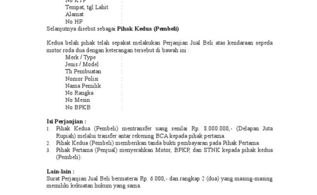 Surat Perjanjian Jual Beli Motorsikal - Contoh Surat Perjanjian Jual Beli Sepeda Motor